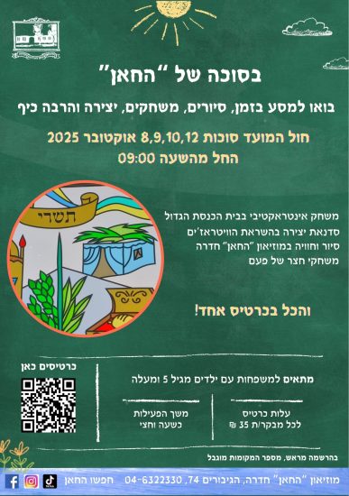מחפשים פעילות חווייתית ומרתקת לחופשת הסוכות? בואו לחוות את ההיסטוריה של חדרה בצורה שונה לגמרי! אנו מזמינים אתכם למסע בזמן, שמשלב סיור, משחקים, יצירה והרבה כיף לכל המשפחה.