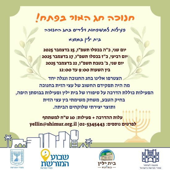 בית ילין במוצא מזמין אתכם לפעילות למשפחות וילדים בחג החנוכה