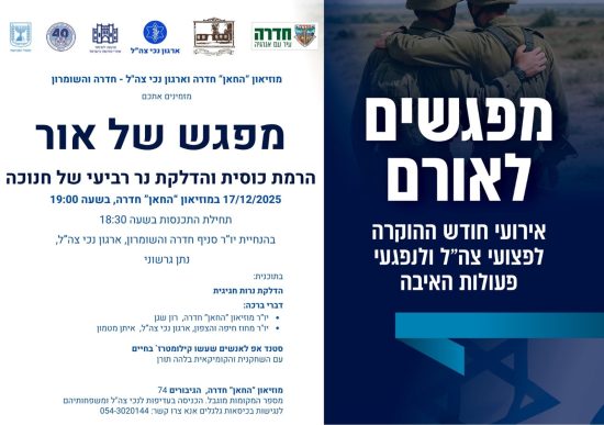מוזיאון "החאן" חדרה וארגון נכי צה"ל, סניף חדרה והשומרון, מזמינים אתכם למפגש מיוחד של קהילה, הוקרה ואופטימיות בגובה העיניים עם האנשים שעשו מילואים בחיים עצמם, עם הכאב.