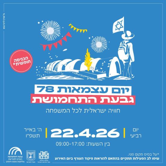 יום רביעי, ה' באייר תשפ"ו, 22 באפריל 2026, בין השעות 09:00–17:00