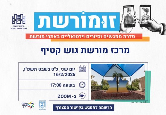 מוזמנים להצטרף אלינו בזום לסיור וירטואלי מודרך, בכל פעם באתר מורשת אחר. בסוף הסיור – שאלות ותשובות עם צוות האתר.