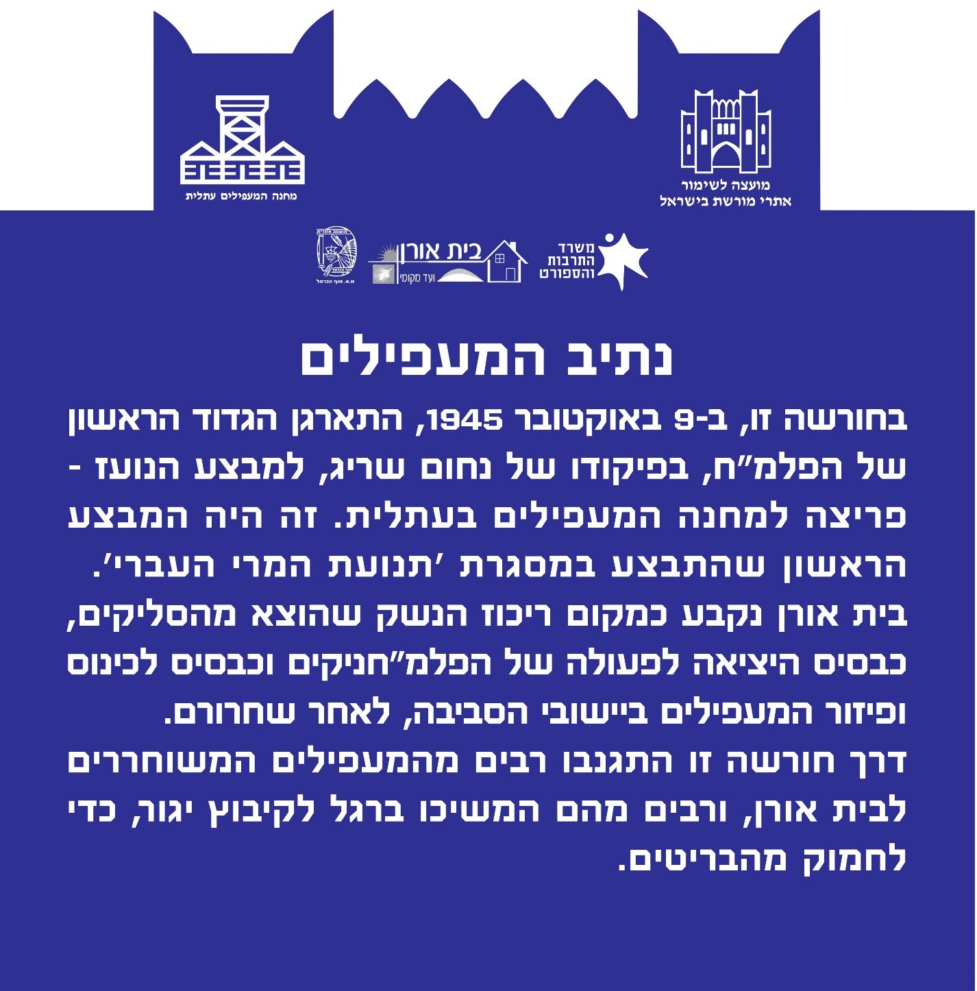 בית אורן נקבע כמקום ריכוז הנשק שהוצא מהסליקים, כבסיס היציאה לפעולה של הפלמ"חניקים וכבסיס לכינוס ופיזור המעפילים ביישובי הסביבה, לאחר שחרורם.